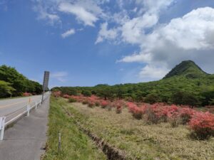 道路両脇に真っ赤に咲くツツジと新緑のコントラストは一見の価値があります!